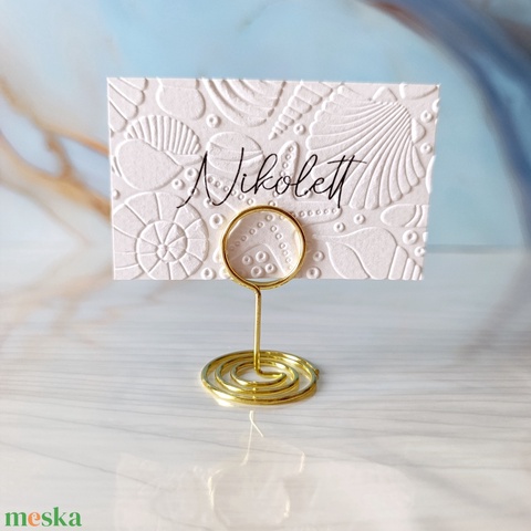 Dombornyomott esküvői ültetőkártya tengerpi témában, névtábla, ültetőkártya, domborított, kagylók, nyaralás, utazás