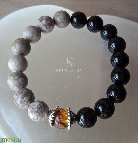 Ónix borostyánnal és fosszilis gyöngyökkel