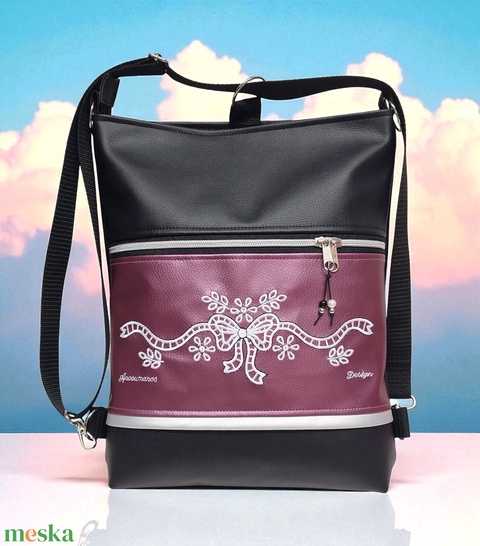 Hímzett masnis 3in1 hátizsák univerzális táska fekete-gyöngyházlila