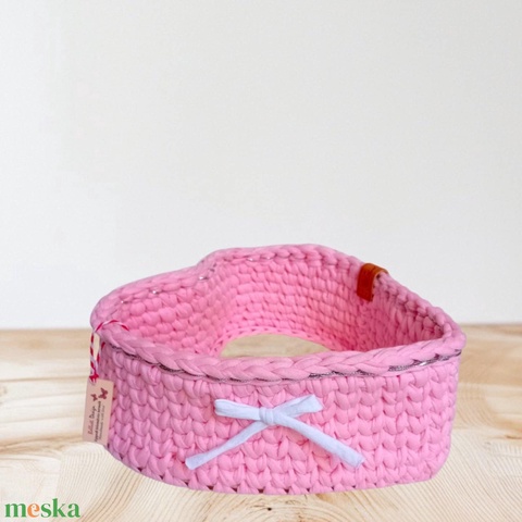 Ezt a kézzel horgolt, szív alakú kosarat nem csak a pékáruk és édességek számára alkottam meg, hanem azért, hogy minden nap emlékeztessen a szeretet erejére. A puha, rózsaszínű fonalból készült, finom masnival díszített kosárka a törődés és a figyelmesség szimbóluma.