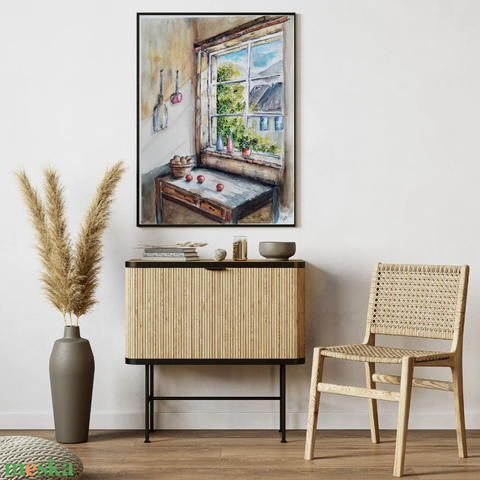 Ez a festmény nem csupán egy ablakról szól, hanem arról az érzésről, amikor a fény és a múlt találkozik. A Color Glide Layering saját technikám, amelyben a színek nem keverednek, hanem egymásba siklanak – így minden réteg új emléket hordoz. A scratching technikával a fényt is ’belekarcolom’ a papírba: ettől lesz a textúra kézzel fogható, szinte plasztikus. A képet tudatos időszövés építi, ami megőrzi és továbbélteti a pillanatokat. Minden ecsetvonás és minden réteg az én saját világomból születik – ezért nem ismételhető, ezért egyedi.