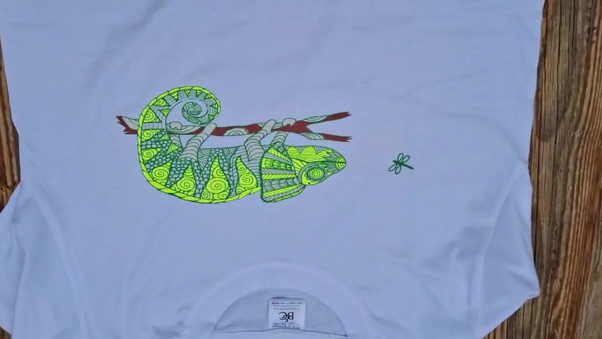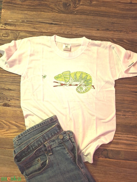 Fehér pamutpóló egy napfény hatására színváltó grafikával. A szín erőssége a napfény vagy UV fény erejének megfelelően változik. A nyomat teljesen stabil, mosást jól tűrő, hosszú élettartamú. Ami fontos, mosásnál a fehérítő használata tilos, mert egyes agresszív fehérítők a színváltó képességet ronthatják !!!! A nyomatot vasalni kifordított pólón keresztül lehet csak.