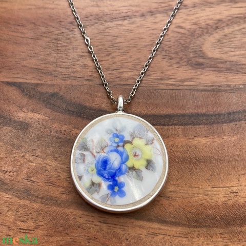 Zsolnay mentett darabok - virágos porcelán nyaklánc - kerek medál nemesacél lánccal