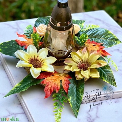 Őszi mécses tartós koszorú sárga és narancs virágokkal
