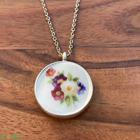 Zsolnay mentett darabok - virágcsokros porcelán nyaklánc - kerek medál nemesacél lánccal