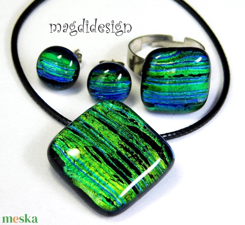 Zöld csíkos üvegékszer szett nyaklánc gyűrű stiftes fülbevaló
