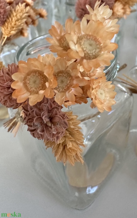 • Szárazvirág díszítés több színben (pl. lila, narancs, natúr), így a dekoráció harmonizálhat az esküvő színeivel.