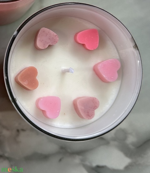 Ez a szójaviasz gyertya szívből szól. A tetején apró szívecskék és akár monogram is megjelenhet, szintén szójából öntve – így minden részlete természetes és kézzel készült. Az üvegfólia színe és a szívecskék árnyalata egyedileg választható, ahogy az illat is.