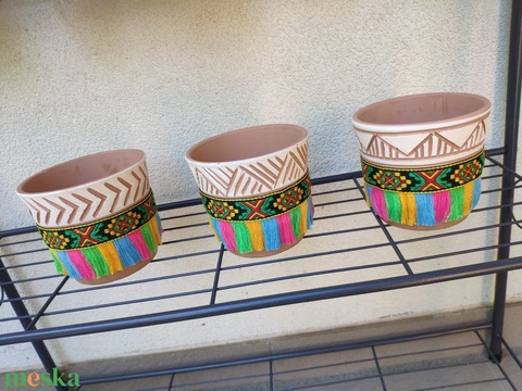 'INDIÁN NYÁR' festett terrakotta kaspók/mécses-/gyertyatartók színes szőtt szalagokkal