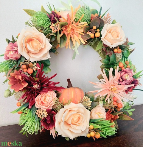 - Anyaga: koszorúalap, szatén szalag, termés, egyéb dekorációk, ragasztó, szárazvirág, élethű virág