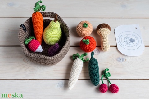 Horgolt zöldségek, gyümölcsök barna kosárral (10 db)