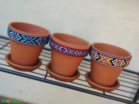 'INDIÁN NYÁR' terrakotta virágcserepek, mécses-/gyertyatartók színes szőtt szalagokkal