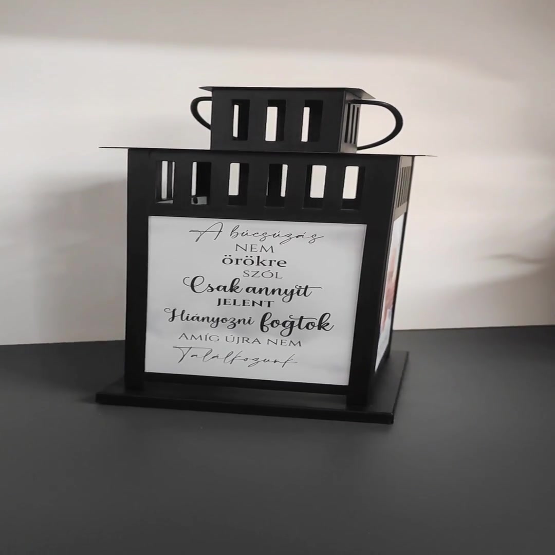 Elegáns, fekete színű fémlámpás UV nyomtatott üveglappal, mely megható verssel emlékezik meg az eltávozott szerettekről. Tökéletes sírdísz, megemlékezés vagy otthoni emlékhely részeként. A mécsestartóban elhelyezett gyertya fénye meghitt hangulatot teremt, míg a szöveg örök emléket állít. Strapabíró fémszerkezetének és minőségi kivitelének köszönhetően hosszú ideig megőrzi szépségét.