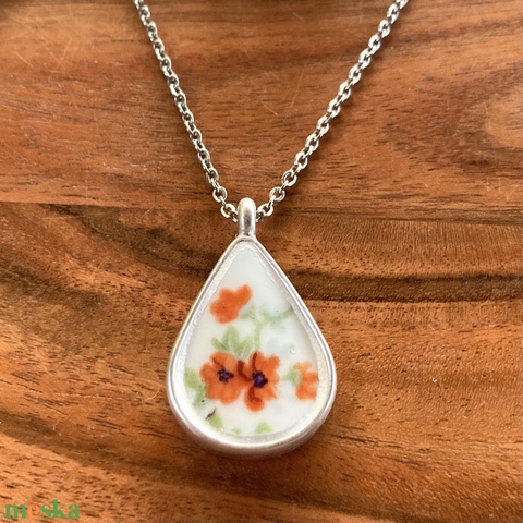 Zsolnay mentett darabok - kisvirágos porcelán nyaklánc - csepp medál nemesacél lánccal
