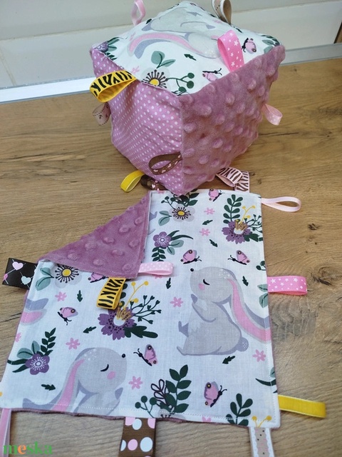 nyuszi mintás címkerongyi+puha csörgő címkekocka szett