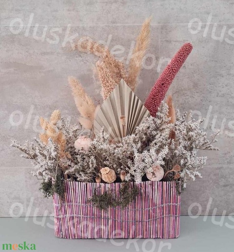 Szárazvirág, natúr, rózsaszín, mályva asztaldísz, virágbox, kézműves dekoráció