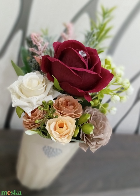 - Anyaga: selyemvirág, kerámia pohár, gyöngy