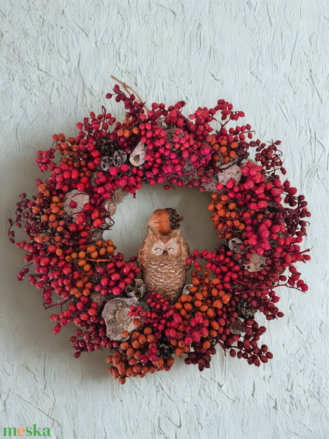 Őszi baglyos ajtódísz – természetes, bogyós koszorú