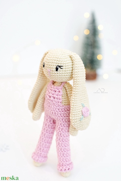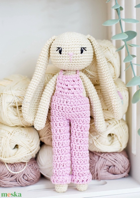 Horgolt nyuszi lógó fülekkel, virághímzéssel