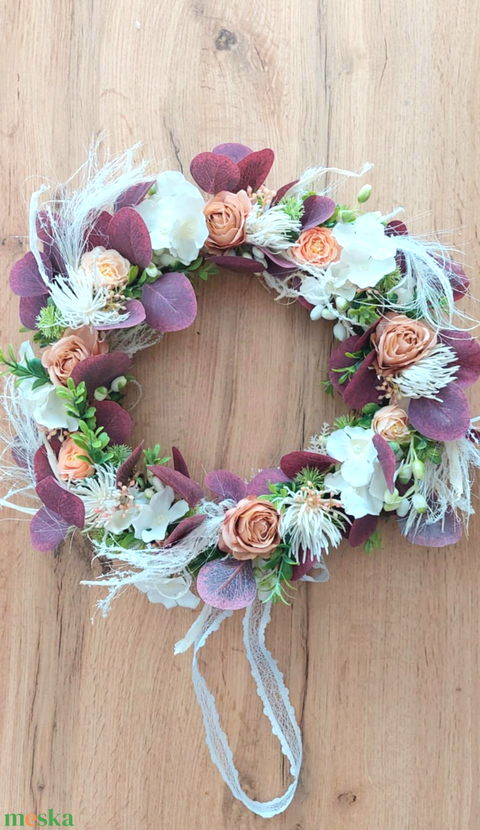 - Anyaga: koszorúalap, szatén szalag, termés, egyéb dekorációk, ragasztó, szárazvirág, élethű virág
