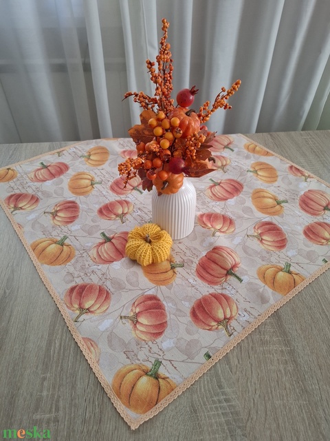 Őszi terítő, asztalközép pamutcsipkével - tökös, őszies narancs színvilágban