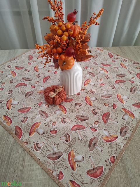 Őszi terítő, asztalközép pamutcsipkével - gombás, őszies natúr színvilágban