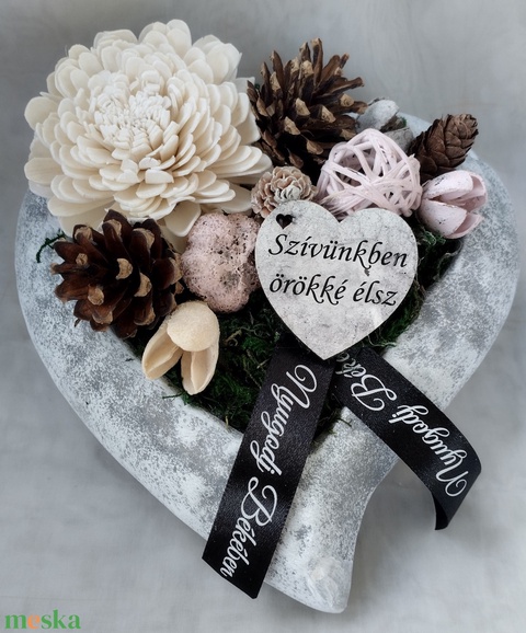 Beton szív kaspós sírdísz termésekkel