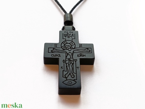 Ébenfába vésett hit – a keresztre feszített Megváltó örök emléke egy elegáns kereszt medálon.
