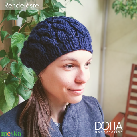 Sötétkék Dotta sapka - vastag meleg puha gyapjús fonalból kötve - csavart mintás női beret, barett