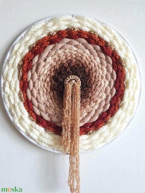 36 cm átmérőjű fémkarika az alapja, szövés technikával készült.
