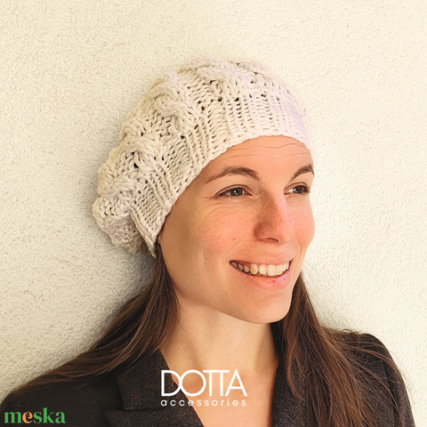 Dotta fehér kötött sapka - kézzel készült téli barett - meleg puha gyapjús fonalból