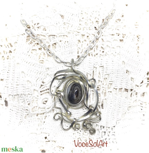 - Anyaga: ezüstözött rézlánc, ezüstözött réz, féldrágakő