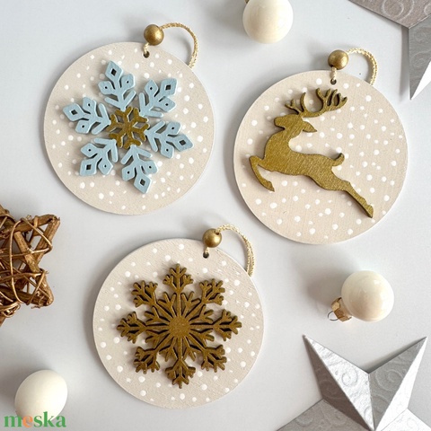 Kézzel festett fa karácsonyfadísz szett – Szarvas és hópelyhek