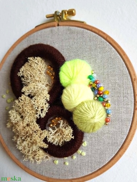 - Anyaga: hímzőráma, pamutvászon, moha, gyöngy