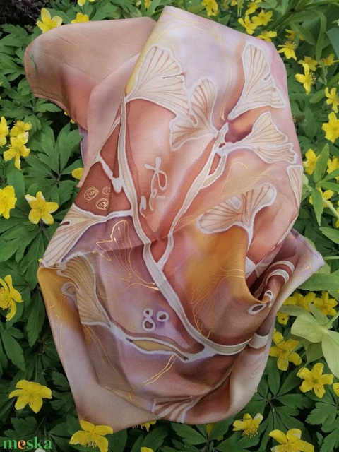 Kézi festésű valódi hernyóselyem kendő-Gingkó levelek