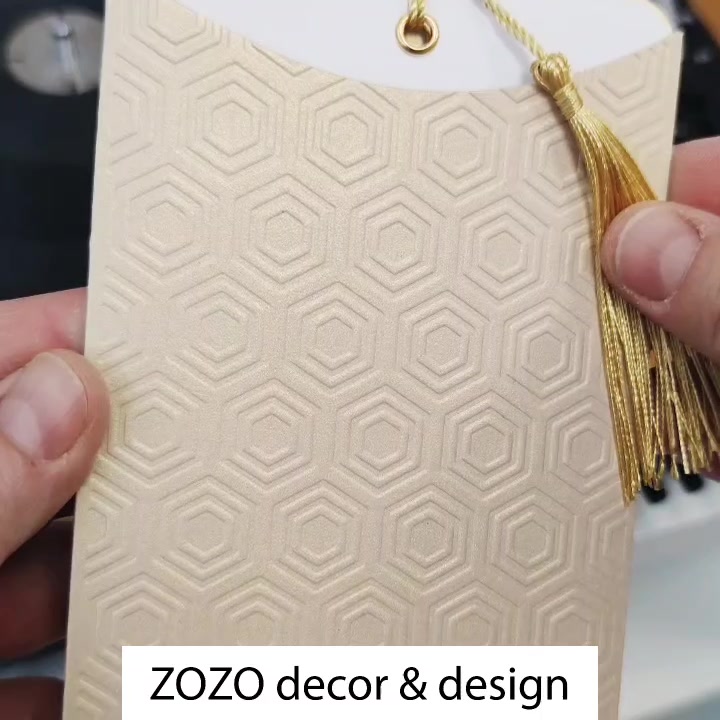A meghívó tokját gyöngyházfényű, pezsgőszínű alapanyagból készítem, melyet a hatszög alakú 3D-s dombornyomott geometrikus minták teszik igazán különlegessé. A meghívó lapja minimalista letisztult dizájnt képvisel, melyen a nyomtatás lehet akár kétoldalas is, hogy minden fontos információ elférjen rajta, pl a hátoldalán a program, vagy akár egy általad választott idézet.