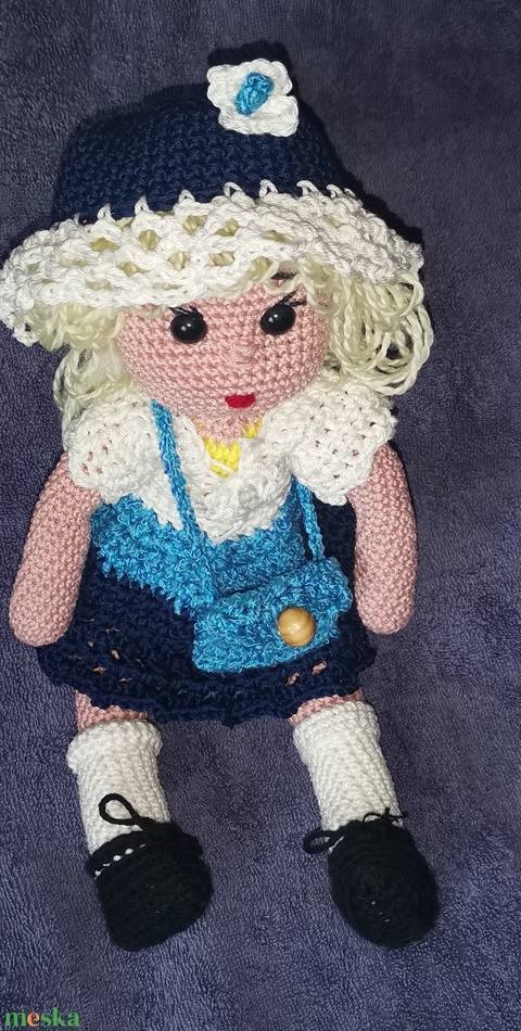 Katinka horgólt baba, kalappal és váltáskával kiegészítve.