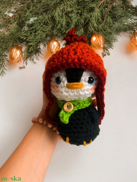 Horgolt pingvin plüss sapkában és sálban karácsonyi ajándék