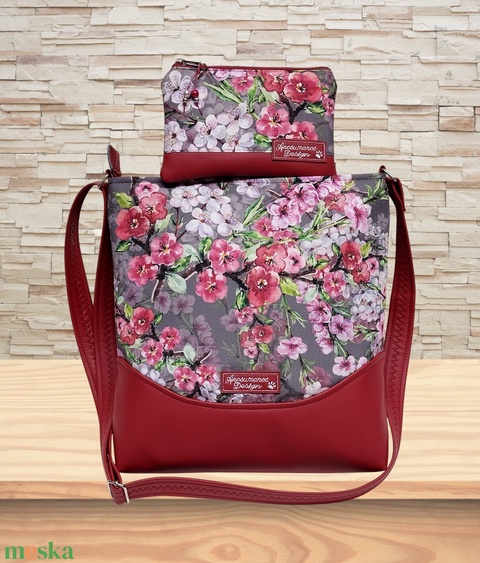 Melanie pakolós válltáska oldaltáska - Cseresznyevirágok bordó alapon textilbőr vállpánttal neszivel