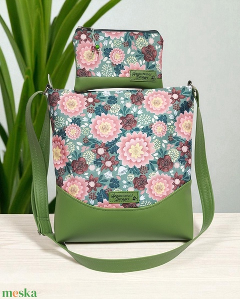 Melanie pakolós válltáska oldaltáska - Ani virágai zöld alapon textilbőr vállpánttal neszivel