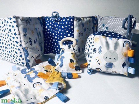 Babaköszöntő ajándékcsomag – kézműves babakocka, rácsvédő, rágóka és címkerongyi újszülötteknek