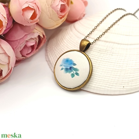 Antik bronz nyaklánc – kék rózsa mintás textillel