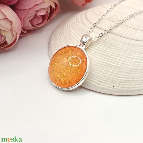Ezüst nyaklánc – narancssárga csillogó textilbőrrel