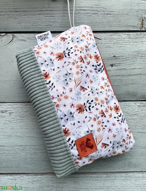 Fehér alapon virágos pipere táska szürkéskék korddal, rozsdaszín cipzárral