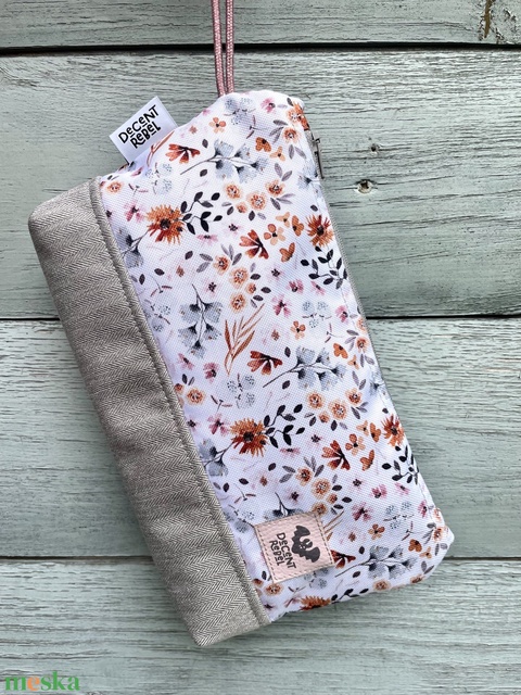 Fehér alapon virágos pipere táska szürke softshellel, szürke cipzárral
