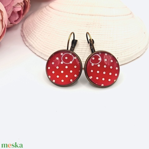 Antik bronz franciakapcsos fülbevaló – piros, fehér pöttyös lencsével