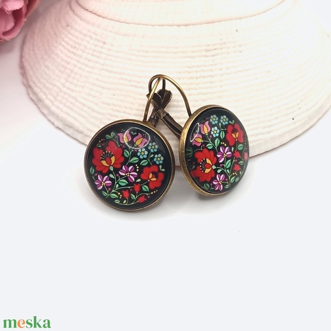 Antik bronz franciakapcsos fülbevaló – matyó mintás lencsével