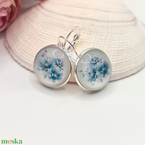 Ezüst franciakapcsos fülbevaló – kék virágmintás lencsével