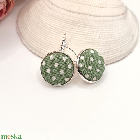 Ezüst franciakapcsos fülbevaló – zöld, fehér pöttyös textillel