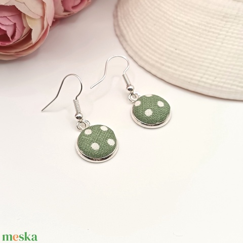 Ezüst franciakapcsos fülbevaló – zöld, fehér pöttyös textillel